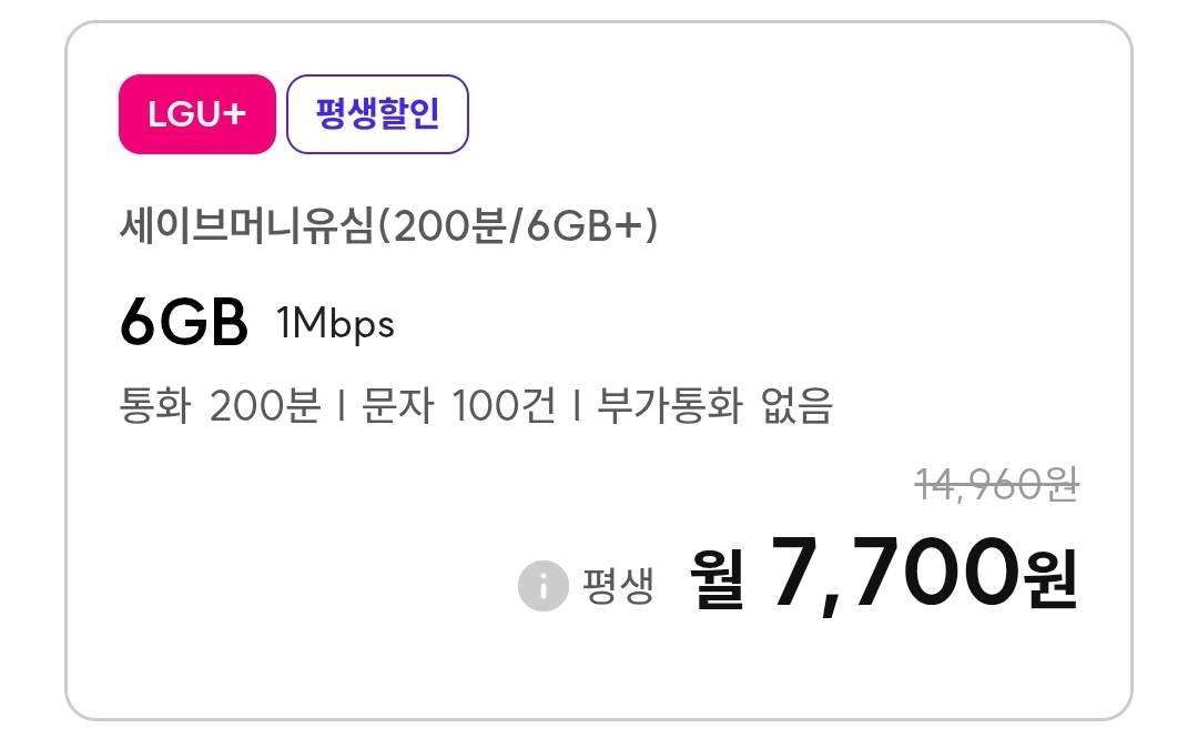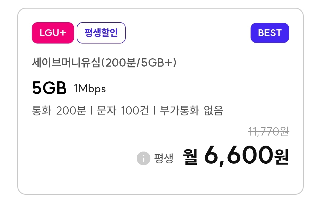 가장 저렴한 월 6600원짜리는 통화 200분, 문자 100건입니다.