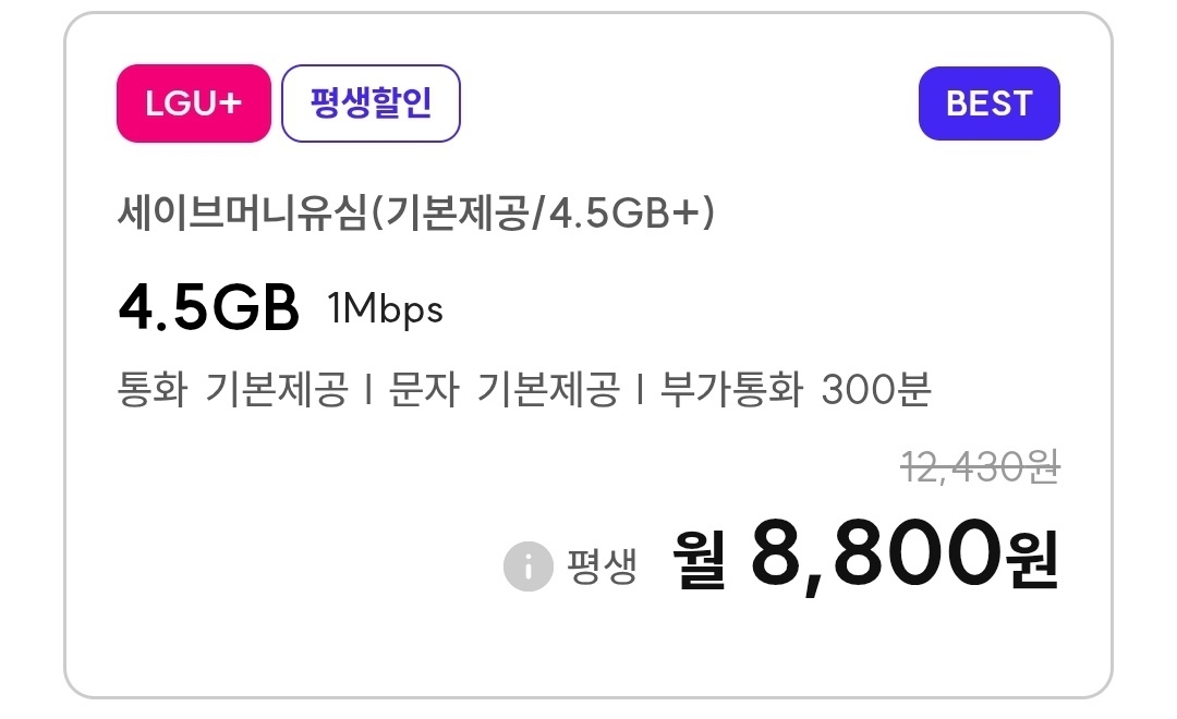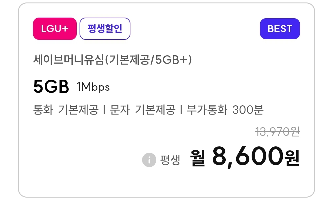 가장 윗급인 월 8600원짜리는 통화문자 기본에 부가통화 300분.