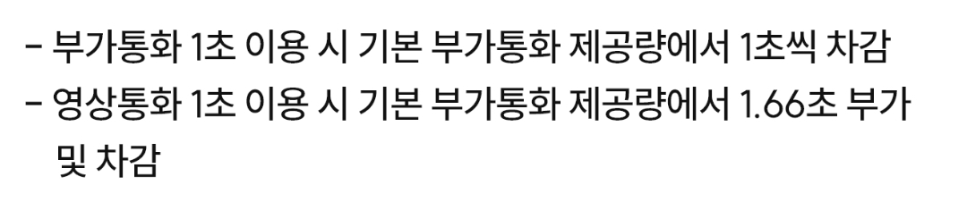 그 밖에, 기본제공통화 무제한인 요금제 중에는 영상통화가 부가통화에서 차감되다가 종량제로 요금부과되는 게 있으니 주의. 이것도 통신사나 요금제에 따라 다를 수 있으니 미리 잘.보세요.