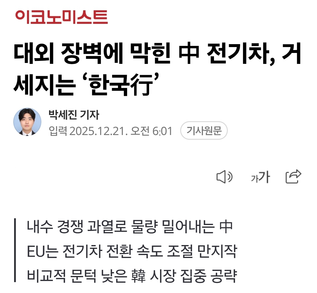 대외 장벽에 막힌 中 전기차, 거세지는 ‘한국行’