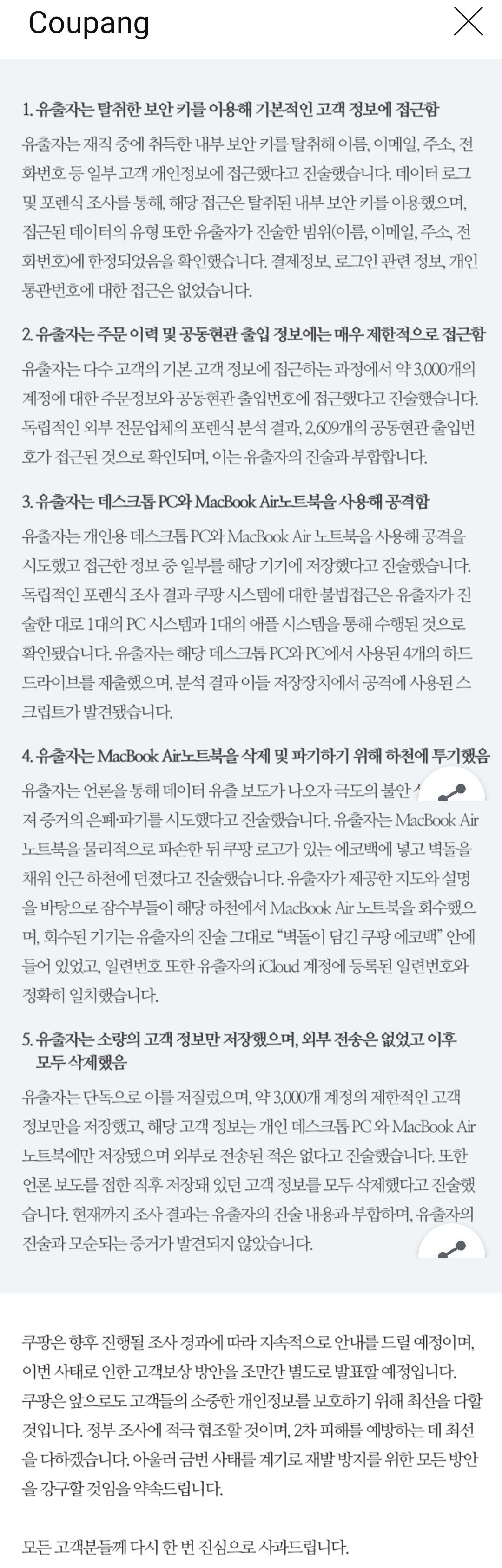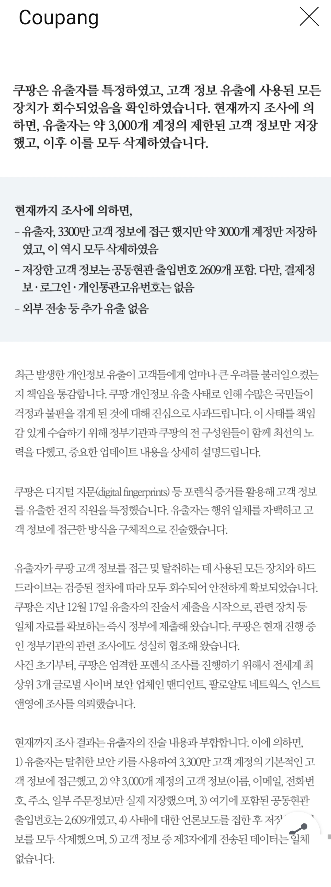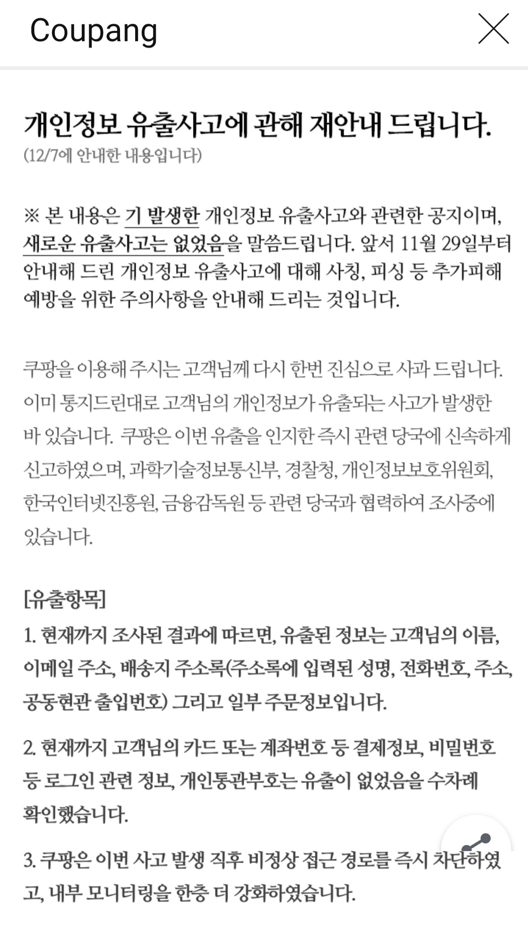 Coupang.com 개인정보 유출사고 재공지 본문
