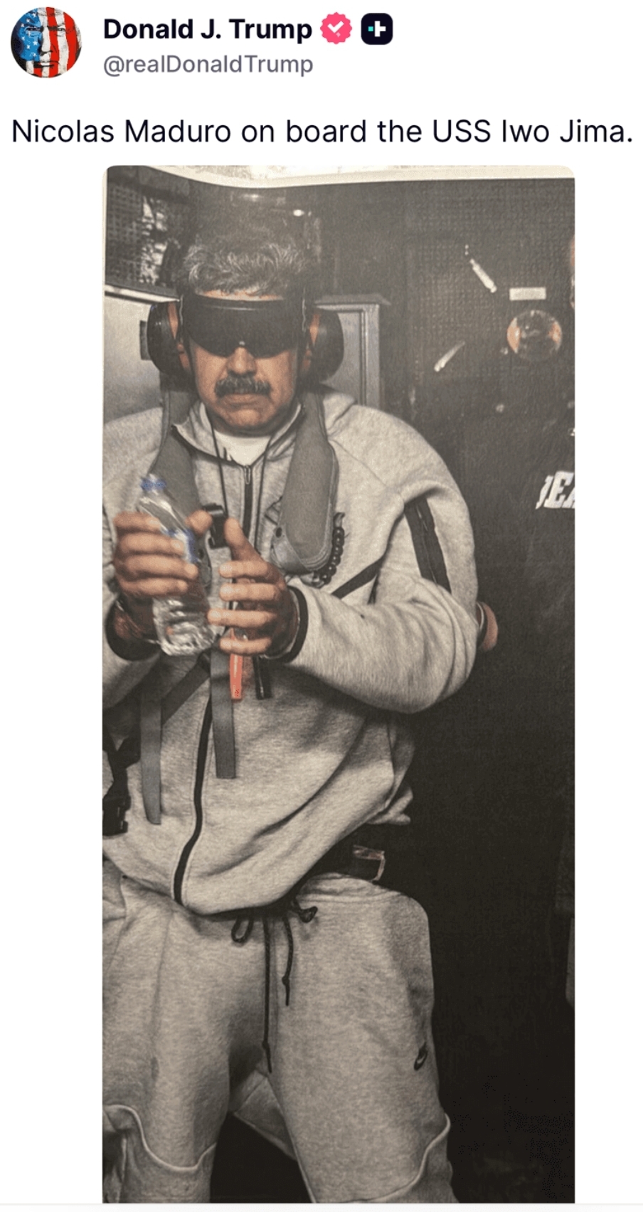 트럼프는 연설을 시작하기 직전에 마두로가 USS 이오지마함에 탑승했을 때 찍은 사진이라며 한 장을 공유했는데 , 그 사진에는 마두로가 눈가리개를 하고 귀마개를 착용한 모습이 담겨 있었다.