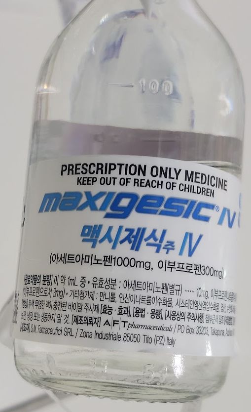 맥시제식주 (maxigesic) : 아세트아미노펜과 NSAID(비스테로이드성 진통제) 조합의 진통소염제 주사.