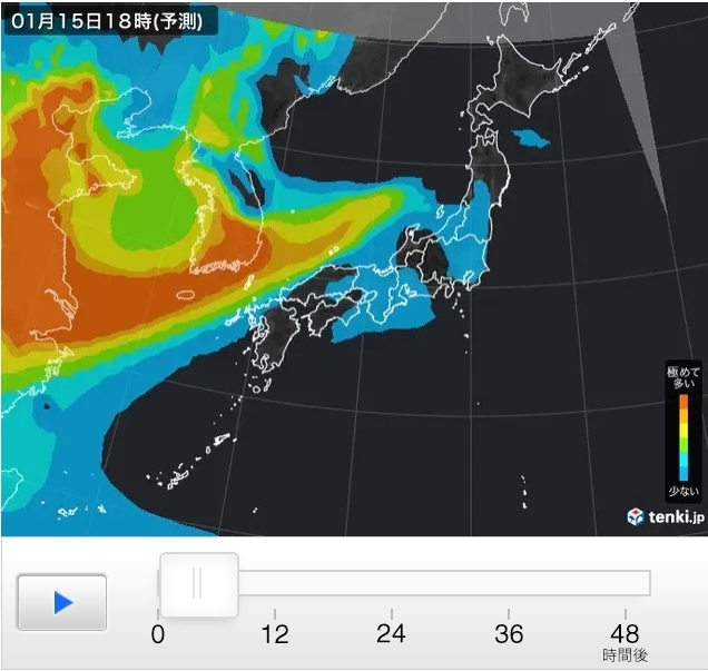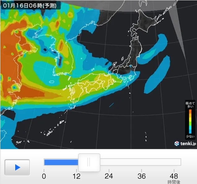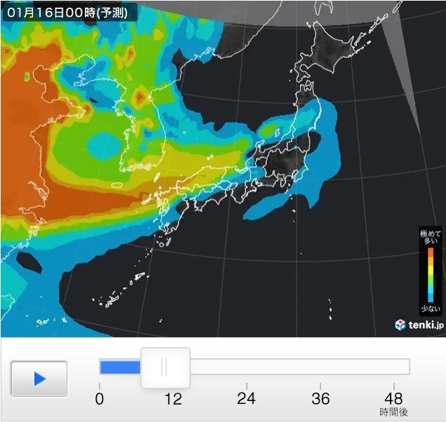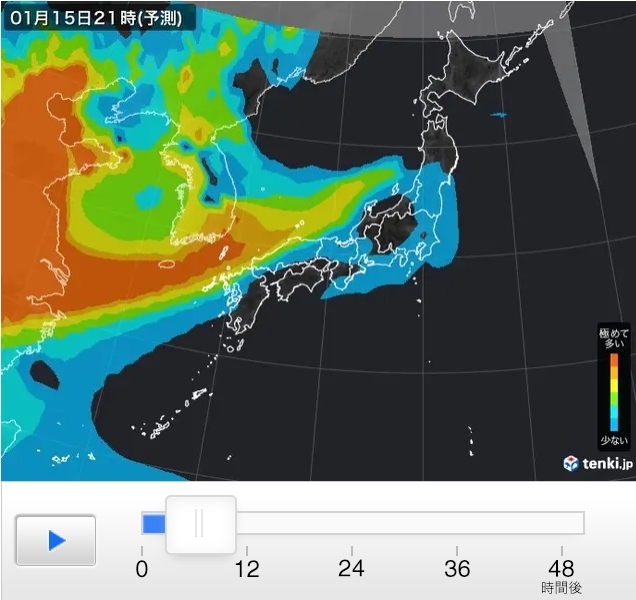 PM2.5予測情報では、健康への影響が懸念されるPM2.5(微小粒子状物質)の分布について、日本気象協会の独自気象予測モデルなどを用いて、現在から48時間先までの傾向を予測しています。