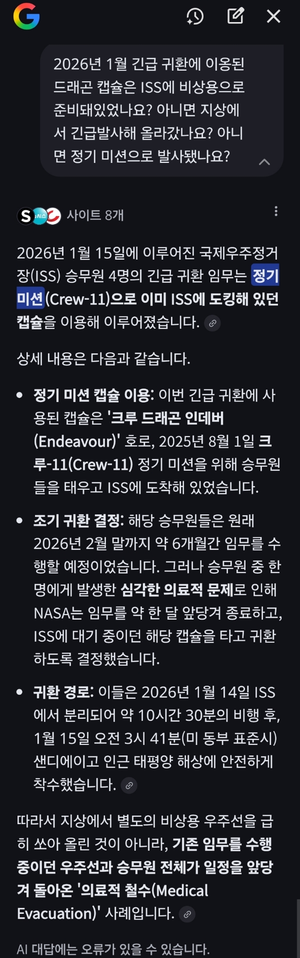2026.1. 스페이스X 크루 드래곤 캡슐을 이용한 국제우주정거장(ISS) 승무원 4명의 긴급 귀환 기사, ai챗봇 문답 본문