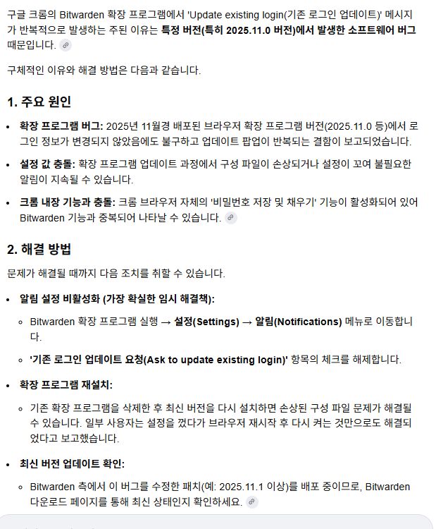 구글 크롬에서 bitwarden 확장 프로그램이 update existing login 메시지를 자주 띄우는 경우 본문