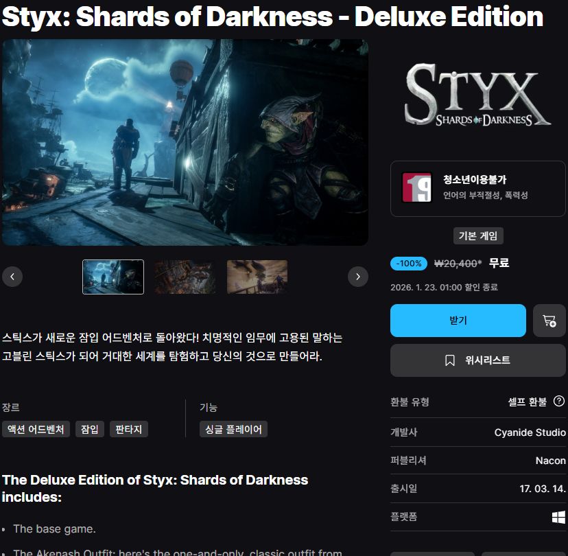 | (에픽게임즈 무료게임) Styx: Master of Shadows (0) | 2026.01.16 |