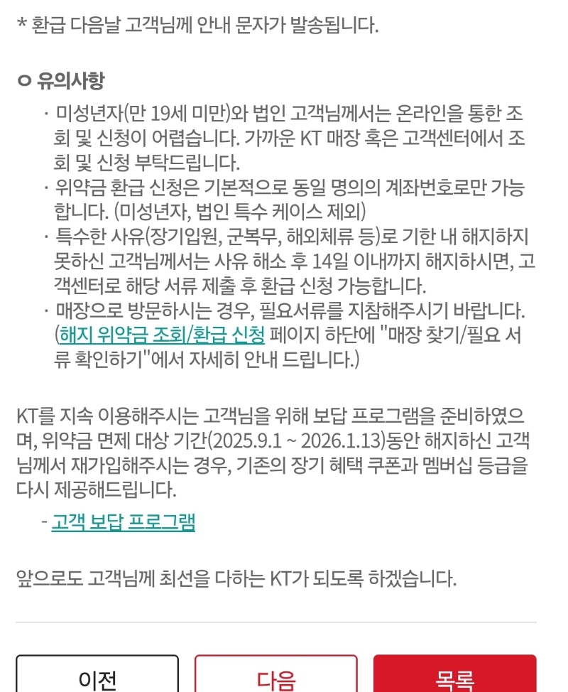 · KT홈페이지 : 해지 위약금 조회/환급 신청 (1월 13일까지는 조회만 가능하며, 환급신청은 1월14일(수) 09시부터 가능합니다.)