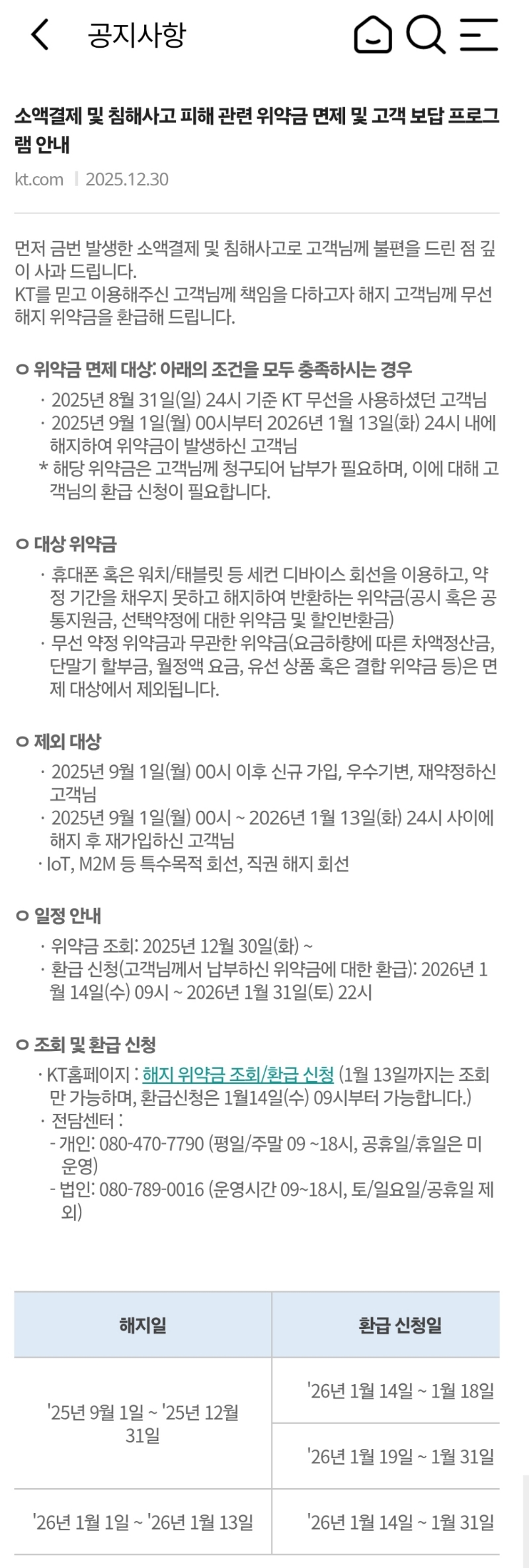 소액결제 및 침해사고 피해 관련 위약금 면제 및 고객 보답 프로그램 안내 kt.com 공지 2025.12.30 본문
