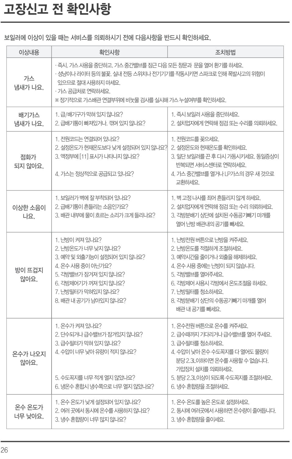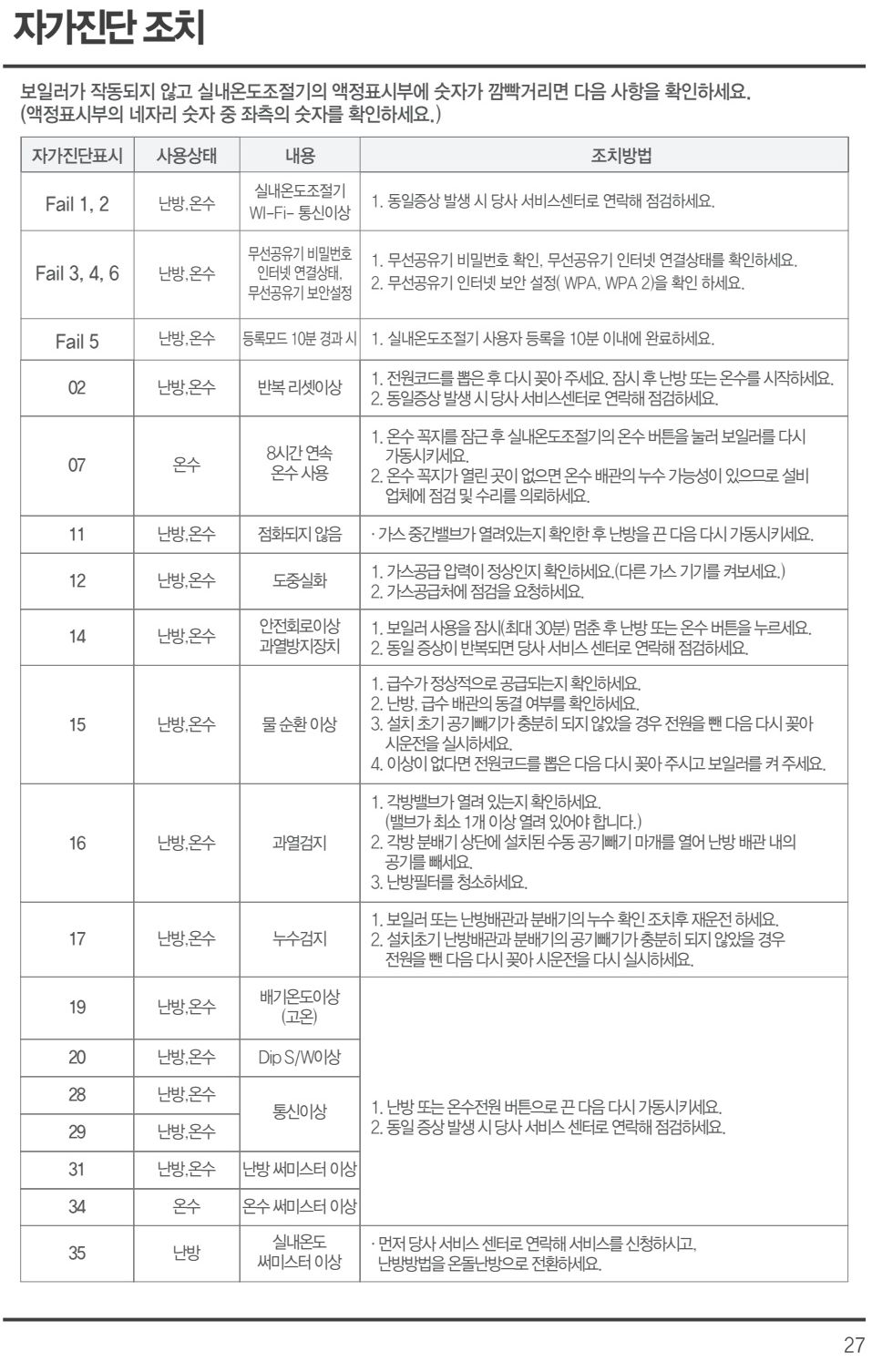 린나이 ROC720 보일러: 필터 청소, 고장신고 전 확인사항, 실내온조조절기의 자가진단표시 코드 본문