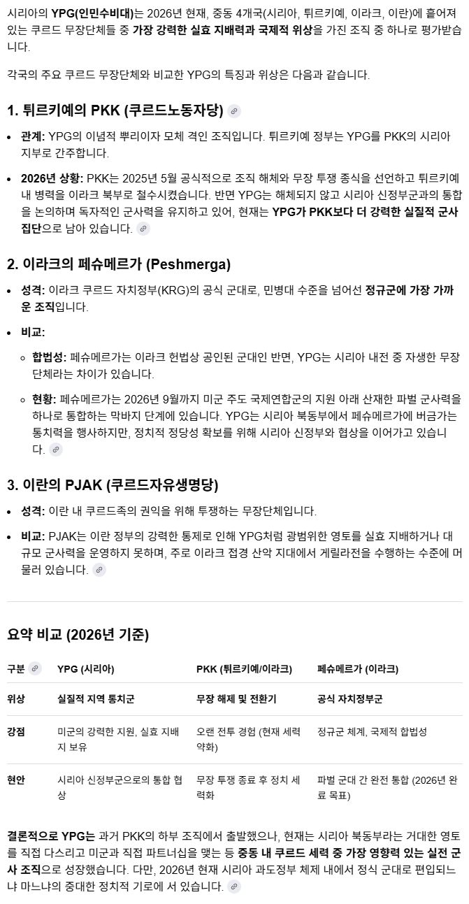 SDF의 중핵이라는 시리아 YPG는 이란, 이라크, 시리아, 터키 4개국에 흩어져있는 쿠르드 단체 중 몇 번째로 평가되나요