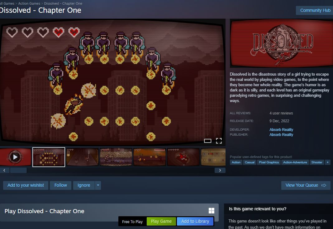 Dissolved is the disastrous story of a girl trying to escape the real world by playing video games, to the point where they become her whole reality. The game's humor is as dark as it is silly, and each level has an original gameplay parodying retro games,