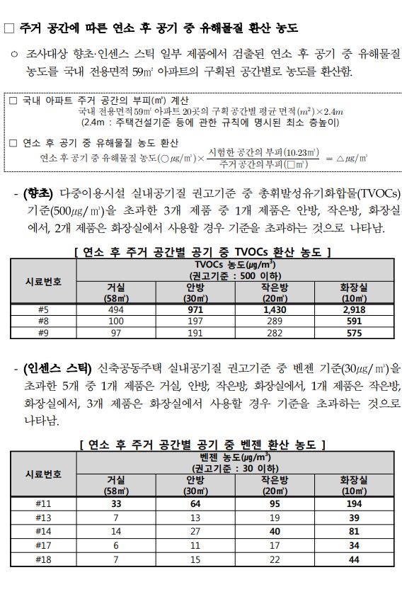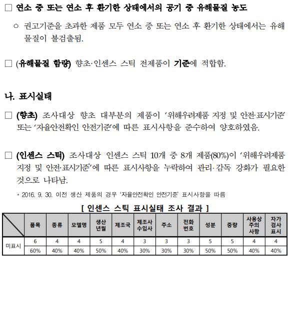 향초와 인센스 스틱은 방향제, 위해우려제품