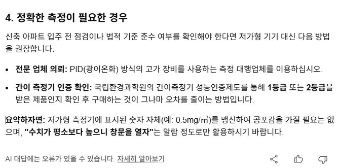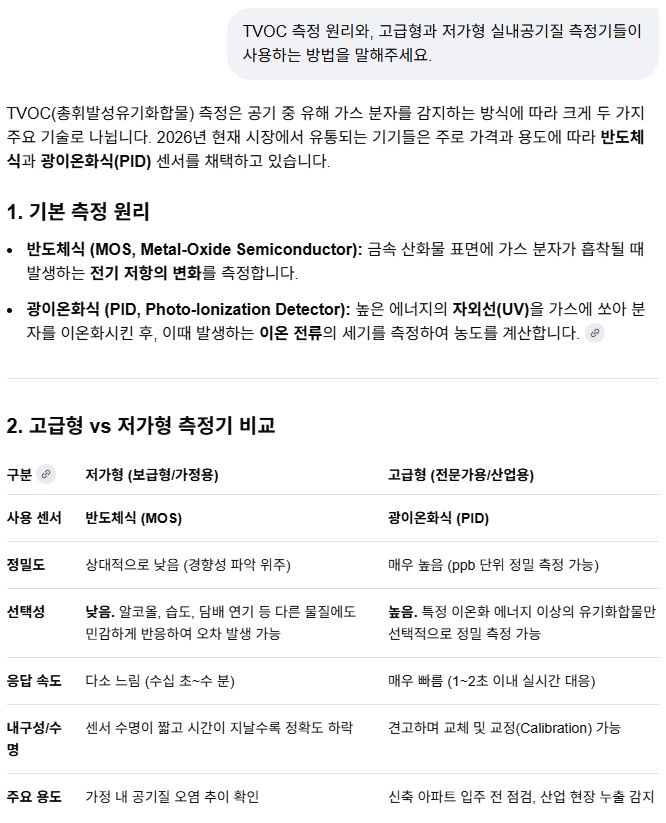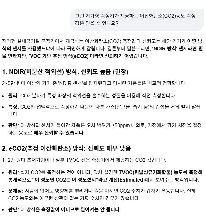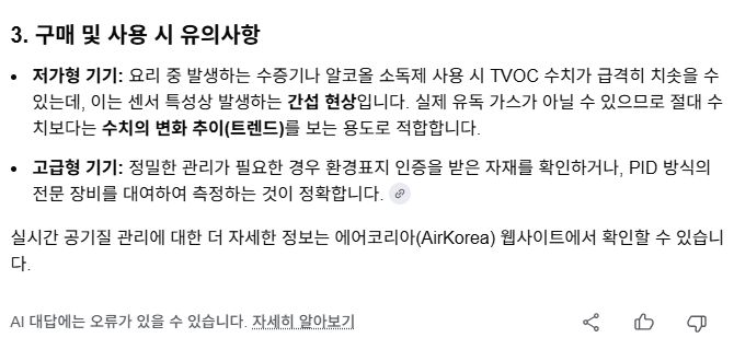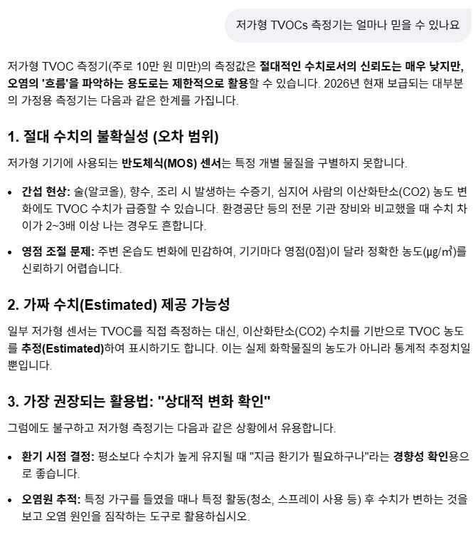 실내 공기 중 TVOC(총휘발성유기화합물) 측정기에 대해, 저가형 TVOC, CO2측정기의 측정값을 못 믿는 것에 대해: AI챗봇 본문