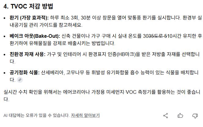 ㅡ 이미 살고 있는 공간에서, 확실한 TVOC 저감 방법은 환기뿐이다. 춥다고 창문닫고 살지 마라. 하루 3번 이상 공기가 차가울 때까지해라. 코로나때 환경부 권장 기준 포스터가 나온 게 있다.