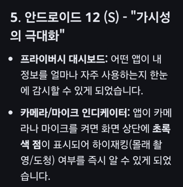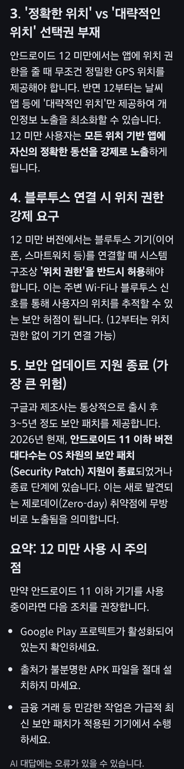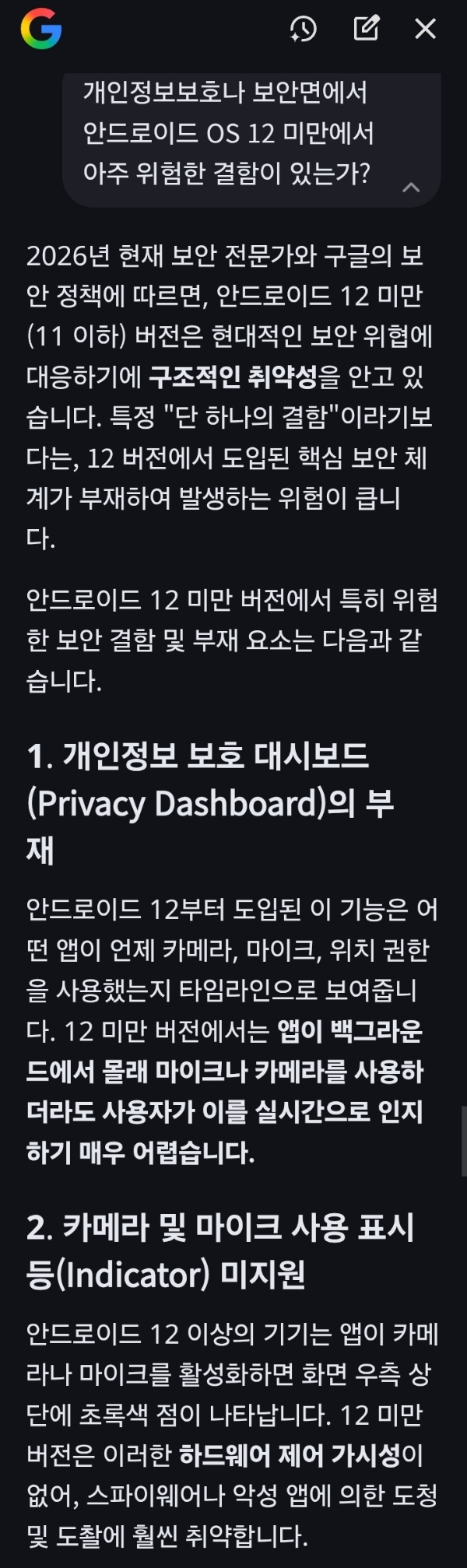 개인정보보호나 보안면에서 안드로이드 OS 12 미만에서 아주 위험한 결함이 있는가?