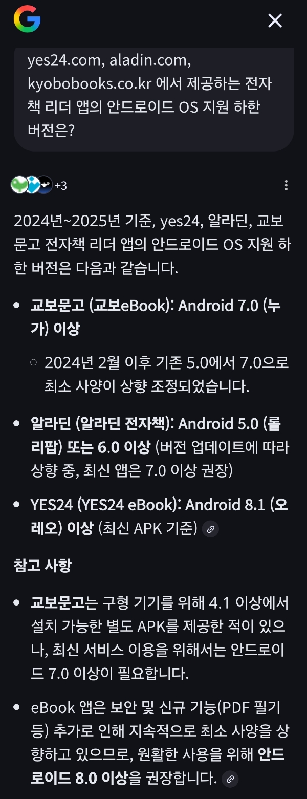yes24.com, aladin.com, kyobobooks.co.kr 에서 제공하는 전자책 리더 앱의 안드로이드 OS 지원 하한 버전