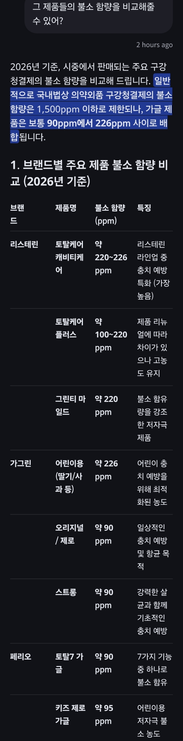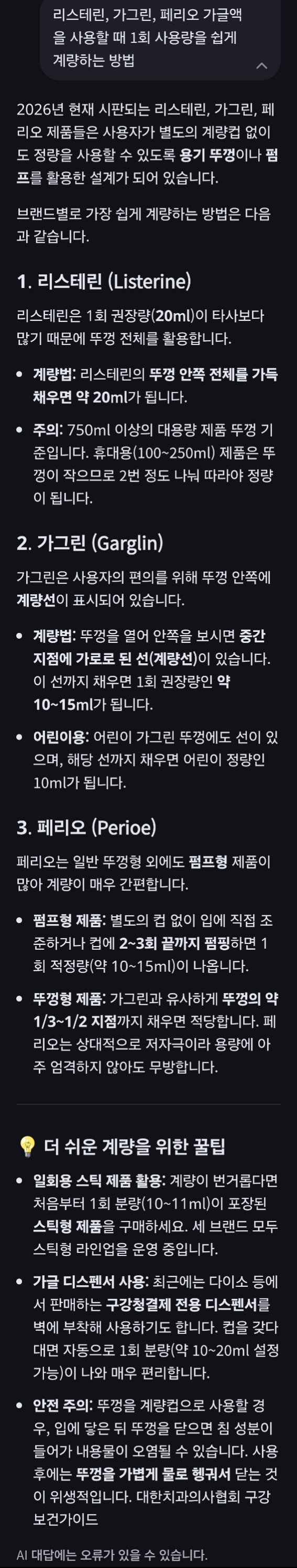 리스테린, 가그린, 페리오 가글액(구강청결제), 알코올과 불소 함유량, 1회 용량 등 : ai챗봇, 챗봇대답의 허점 본문