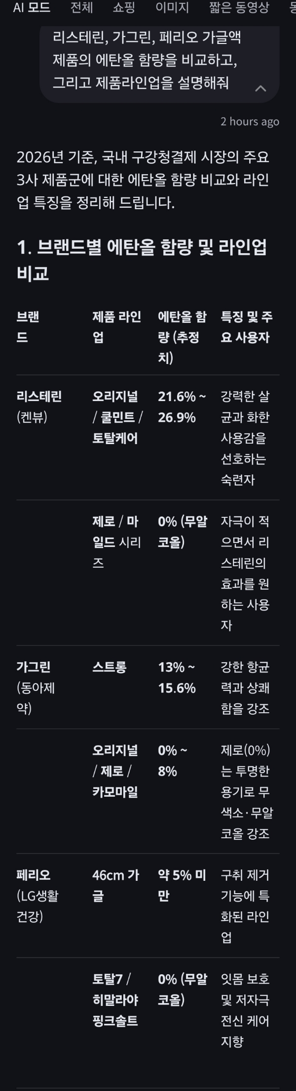 리스테린, 가그린, 페리오 가글액 제품의 에탄올 함량을 비교하고, 그리고 제품라인업을 설명