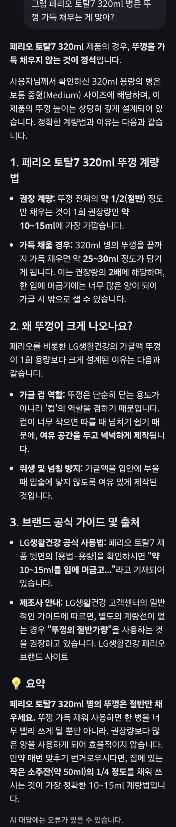 위의 ai대답은 뚜껑으로 계량하라고 적혀 있지만, 그건 250ml 정도 들어가는 작은 병 이야기일 것이다.