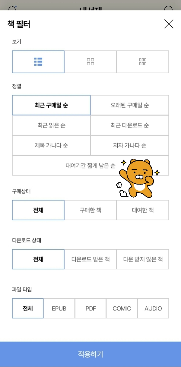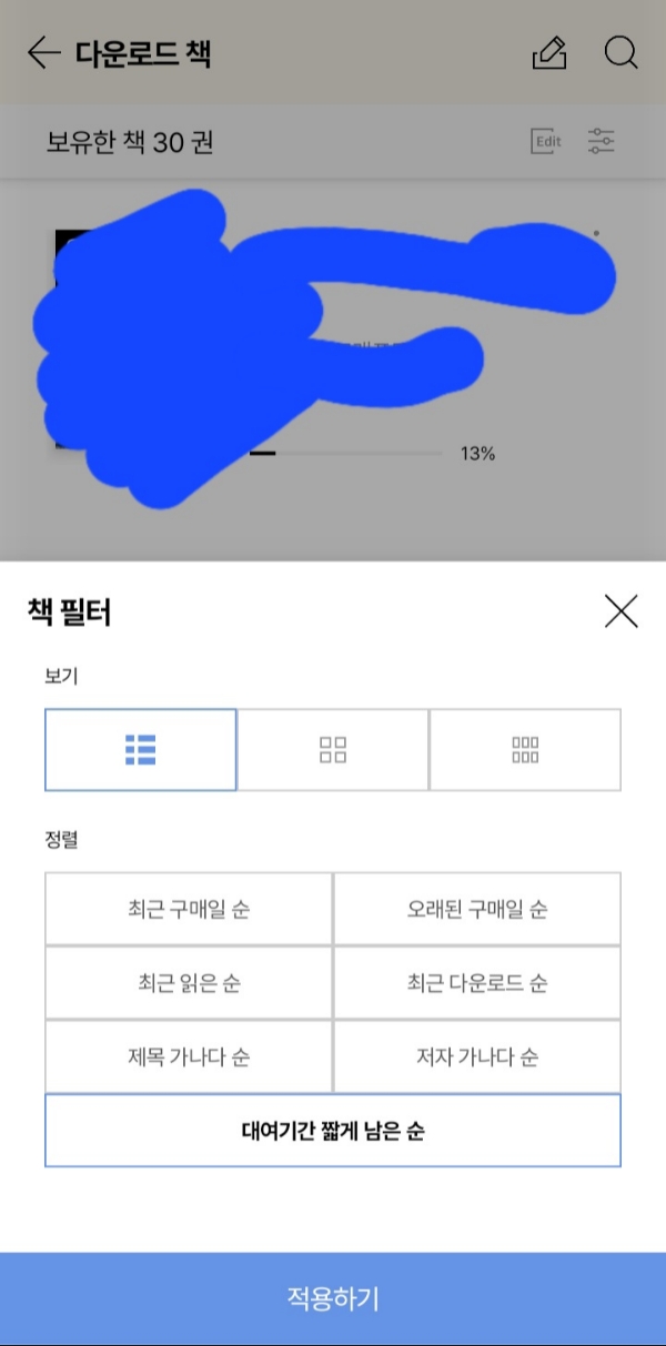구매한 책은 대여기간 짧게 남은 순으로 정렬하는 옵션이 있습니다.