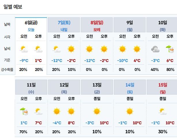 2026.2.6.금.~ 2.15.일. 일기예보: 주말까지 추웠다가 풀리는 날씨 본문