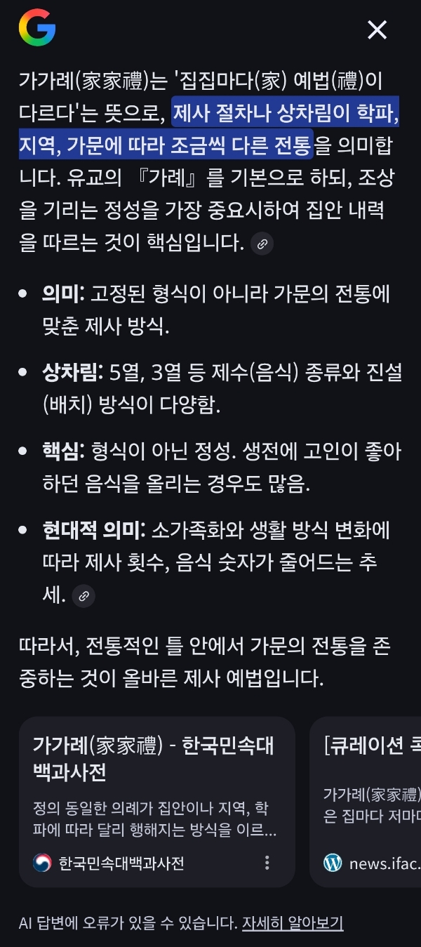 - 이런 것과 진설방식이 완전 가가례에서 벗어나 일정부분 상식처럼 통용되게 된 데는, 과거 가정의례준칙을 만들고는 따라할 만한 예시를 소책자를 만들어 유포한 데 있지 않을까 생각해봅니다. 요즘 세대의 많은 성인 남녀는, 앞 세대의 잘못된 여권의식과 남녀역할 구별때문에, 앞 세대로부터 가정음식 전통을 제대로 이어받지 못했습니다. 요즘 세대의 1020은 달라진 생활문화와 그런 단절의 영향을 다 받고 있는 듯. 그리고 요즘 세대의 성인을 길러낸 그 앞 세대는 급격한 생활양식 변화로 가문과 대가족의 파편화, 핵가족화를 겪으면서 제사 문화를 과거식대로 충분히 전수받지 못하고 부족한 부분을 그런 공인(?)자료에 의지해 채워 가가례를 만들어간 것 같습니다. [본문으로]