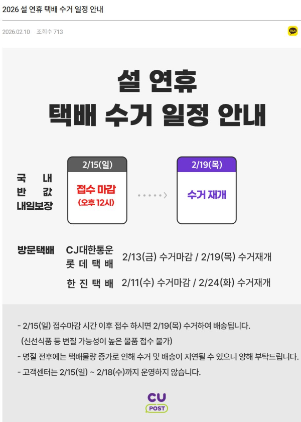 2026년 설 연휴 전 택배접수 마감일직접 찾아본 것. GS25/CU 편의점, 우체국, CJ대한통운택배, 농협택배 본문