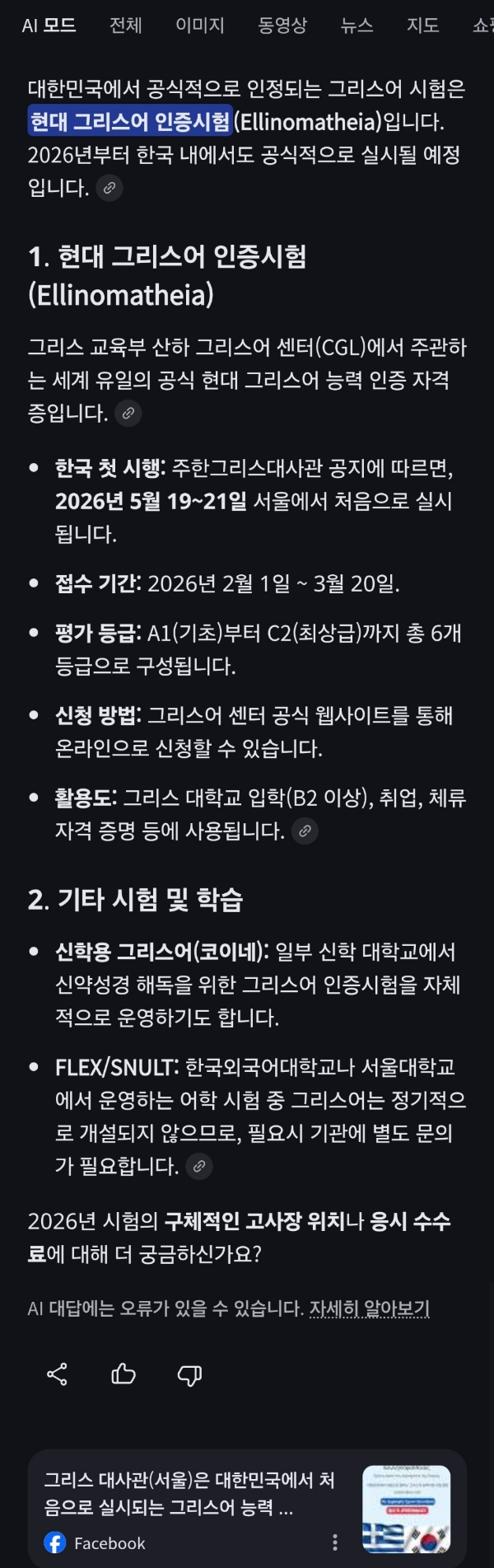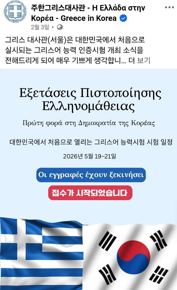 대한민국에서 공식적으로 인정되는 그리스어 시험은 현대 그리스어 인증시험(Ellinomatheia) 본문