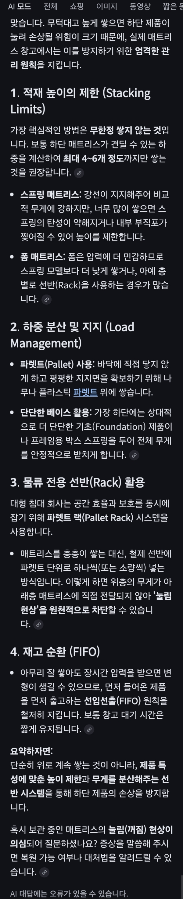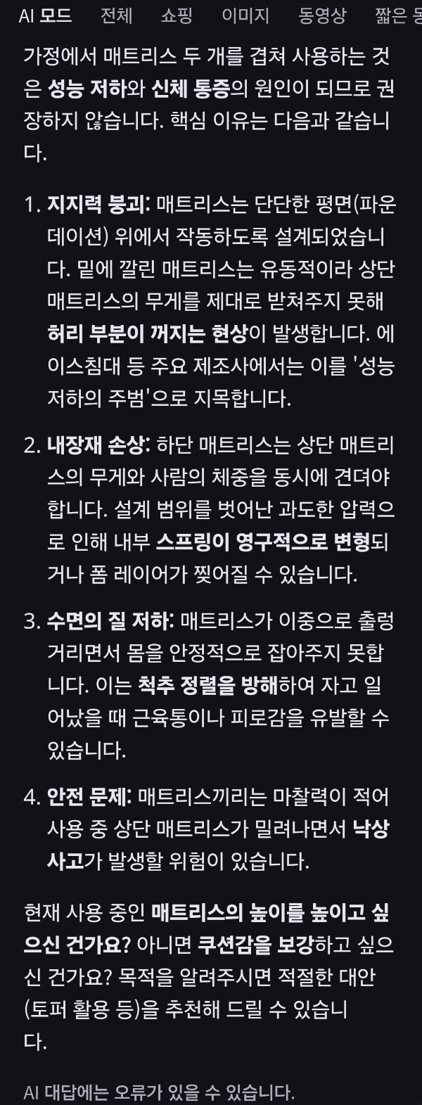 침대 매트리스를 쌓아 보관하는 방식/:/ 임의로 매트리스를 두 겹으로 사용할 때 문제: ai챗봇 본문