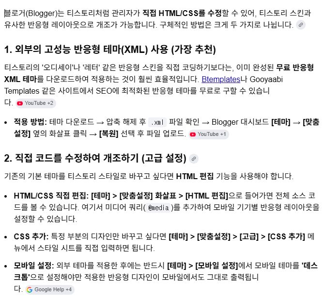 AI: 블로거에 가입했는데, 스킨을 티스토리의 반응형 스킨처럼 개조하려면 어떻게 해야 할까요
