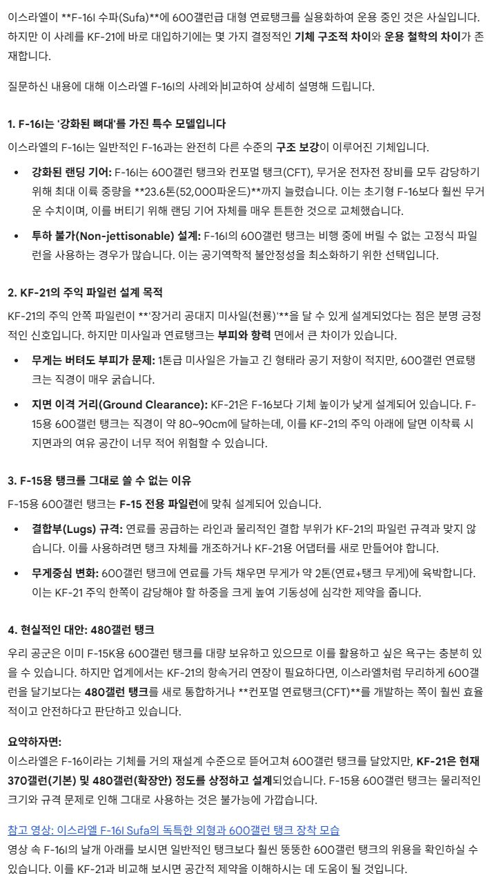 이스라엘이 **F-16I 수파(Sufa)**에 600갤런급 대형 연료탱크를 실용화하여 운용 중인 것은 사실입니다. 하지만 이 사례를 KF-21에 바로 대입하기에는 몇 가지 결정적인 기체 구조적 차이와 운용 철학의 차이가 존재합니다.