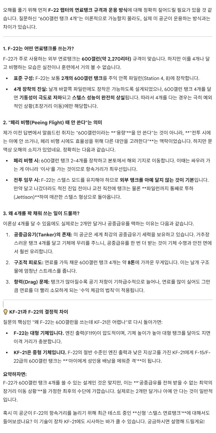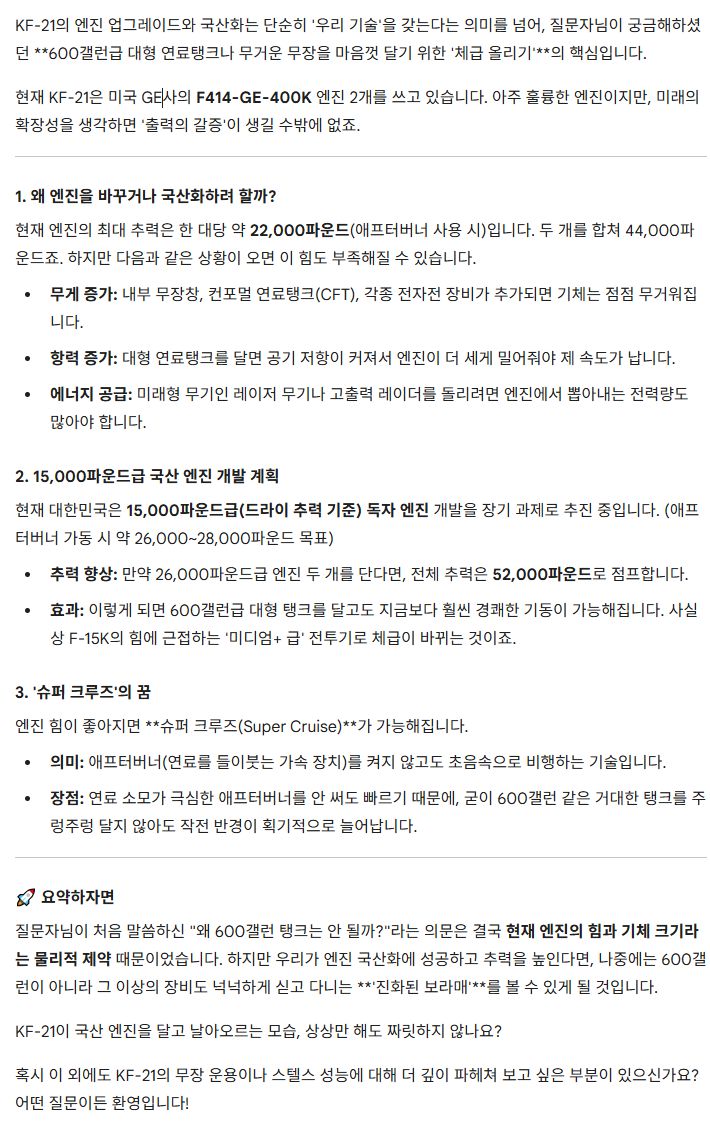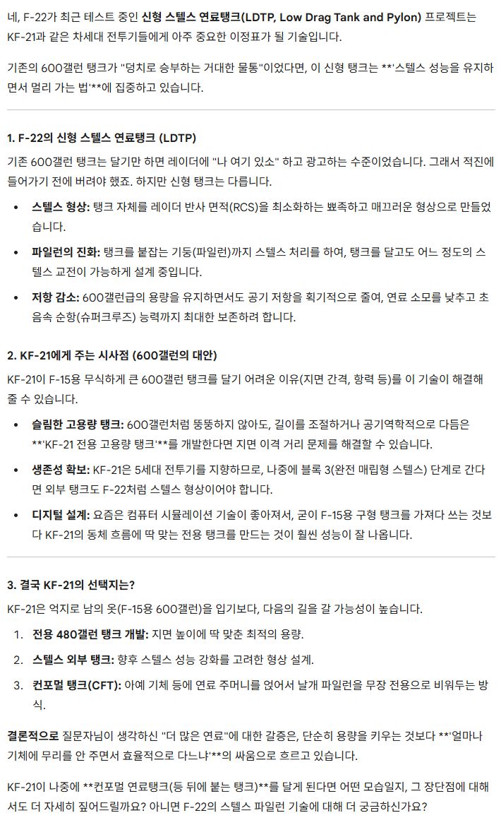 질문자님이 처음 질문하신 600갤런 탱크에 대한 집념(?)은 사실 KF-21의 생존성과 직결되는 아주 날카로운 지적입니다. "스텔스를 위해 무장을 안으로 넣으면 연료가 부족해지고, 연료를 채우려고 탱크를 밖에 달면 스텔스가 깨지는" 이 모순을 해결하는 것이 KF-21 블록 3의 핵심 과제가 될 것입니다.
