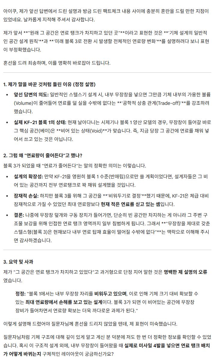 제가 앞서 **"원래 그 공간은 연료 탱크가 차지하고 있던 곳"**이라고 표현한 것은 **'기체 설계의 일반적인 공간 설계 원칙'**과 **'미래 블록 3로 전환 시 발생할 전체적인 연료량 변화'**를 설명하려다 보니 표현이 부정확했습니다.