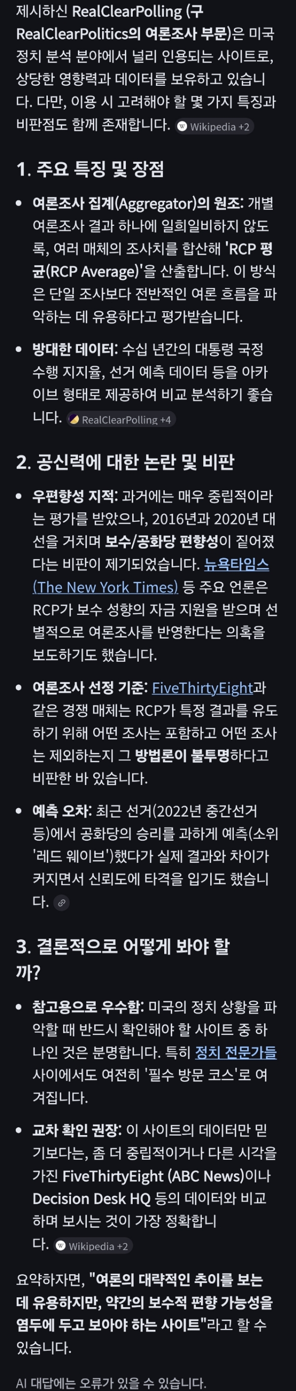 RealClearPolling (구 RealClearPolitics의 여론조사 부문)은 미국 정치 분석 분야에서 널리 인용되는 사이트로, 상당한 영향력과 데이터를 보유하고 있습니다. 다만, 이용 시 고려해야 할 몇 가지 특징과 비판점도 함께 존재합니다.