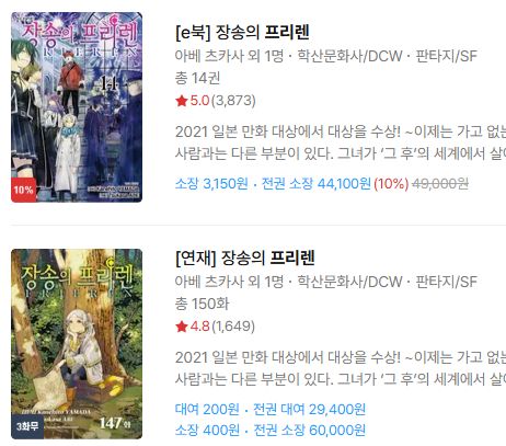 프리렌 본편은, 만화판으로 14권과 팬북까지 나왔지만, 품절이 꽤 있어서.. 지금 따라잡으려면 세트상품을 사거나 이빠진 권은 헌책을 사야 합니다.