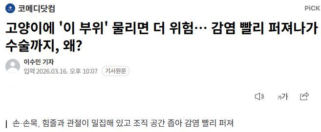 고양이를 다루다 손, 손목, 팔의 관절이나 결합조직에 물리거나 깊게 찔린 상처는 잘 관찰하고 병원갈 것 본문