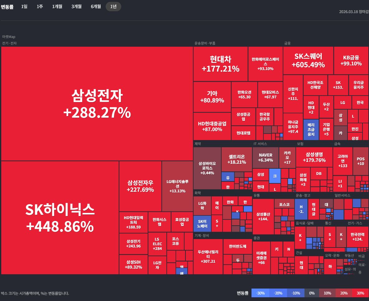 코스피 마켓맵: 최근 1년 삼전과 하닉 시총비는 배로 배로 늘어