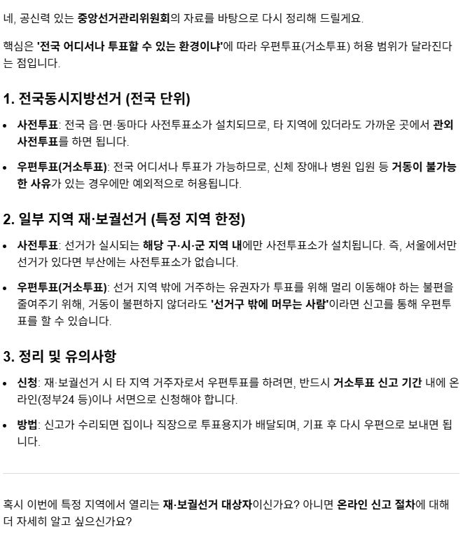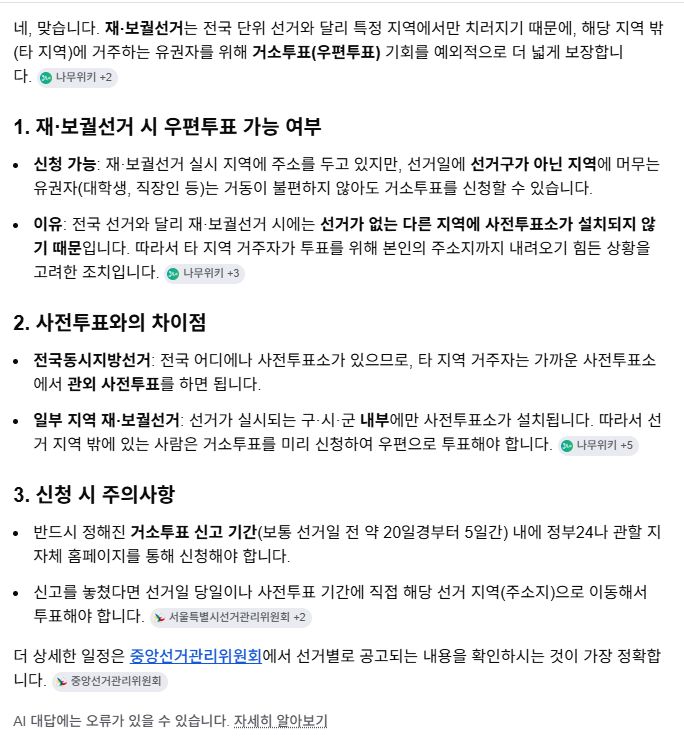 재·보궐선거는 전국 단위 선거와 달리 특정 지역에서만 치러지기 때문에, 해당 지역 밖(타 지역)에 거주하는 유권자를 위해 거소투표(우편투표) 기회를 예외적으로 더 넓게 보장합니다.