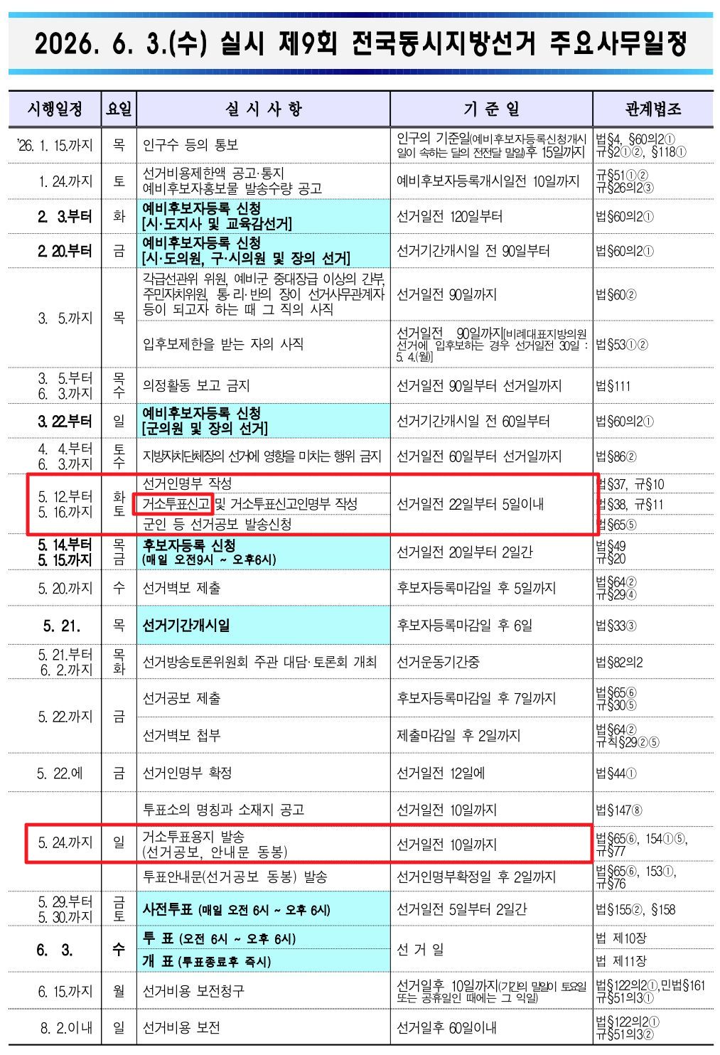 2026. 6. 3.(수) 실시 제9회 전국동시지방선거 주요사무일정