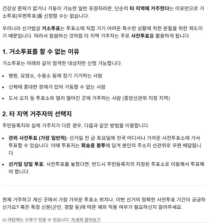 건강상 문제가 없거나 거동이 가능한 일반 유권자라면, 단순히 타 지역에 거주한다는 이유만으로 거소투표(우편투표)를 신청할 수는 없습니다.