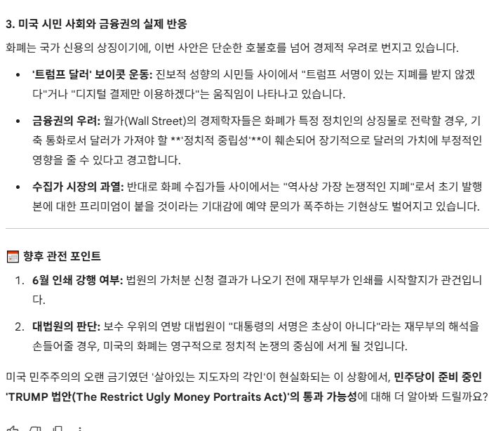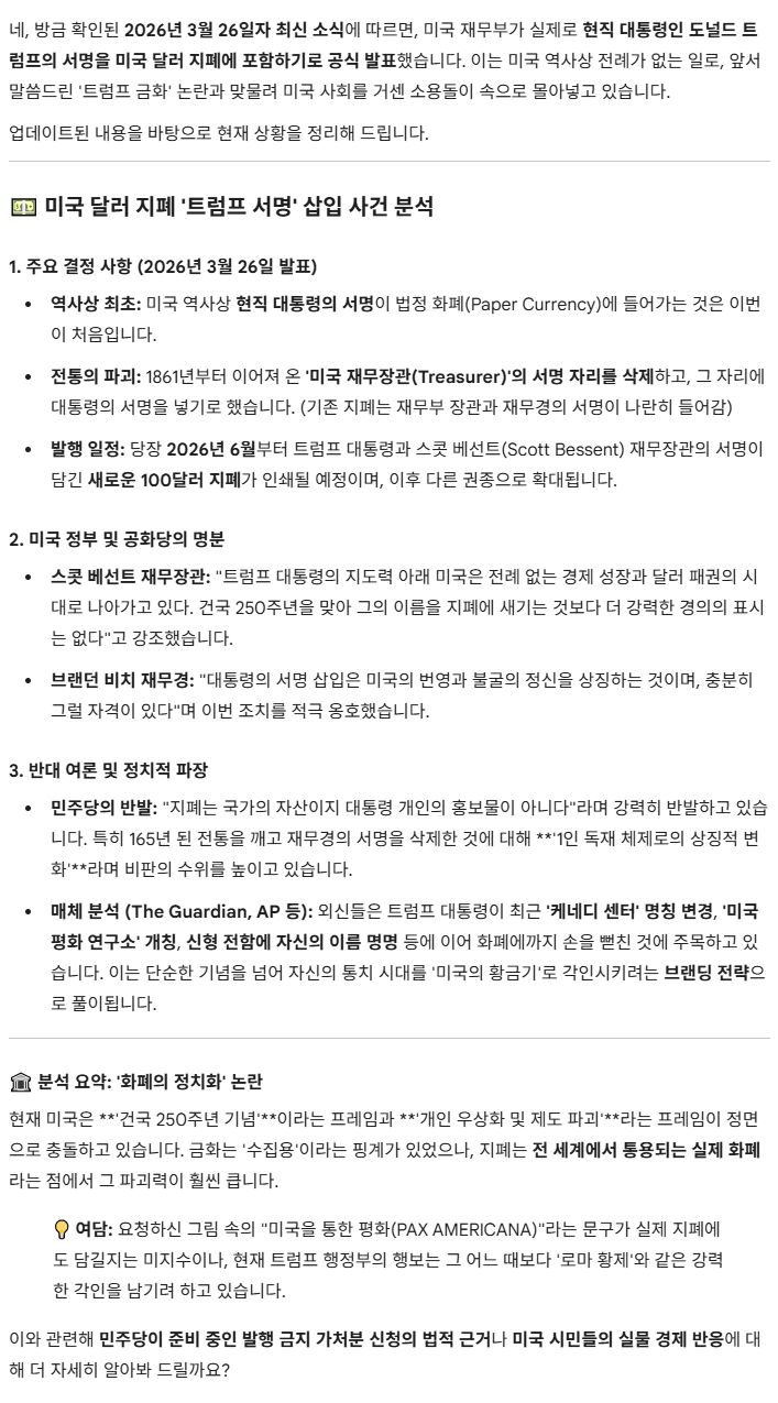 * **금융권의 우려:** 월가(Wall Street)의 경제학자들은 화폐가 특정 정치인의 상징물로 전락할 경우, 기축 통화로서 달러가 가져야 할 **'정치적 중립성'**이 훼손되어 장기적으로 달러의 가치에 부정적인 영향을 줄 수 있다고 경고합니다.