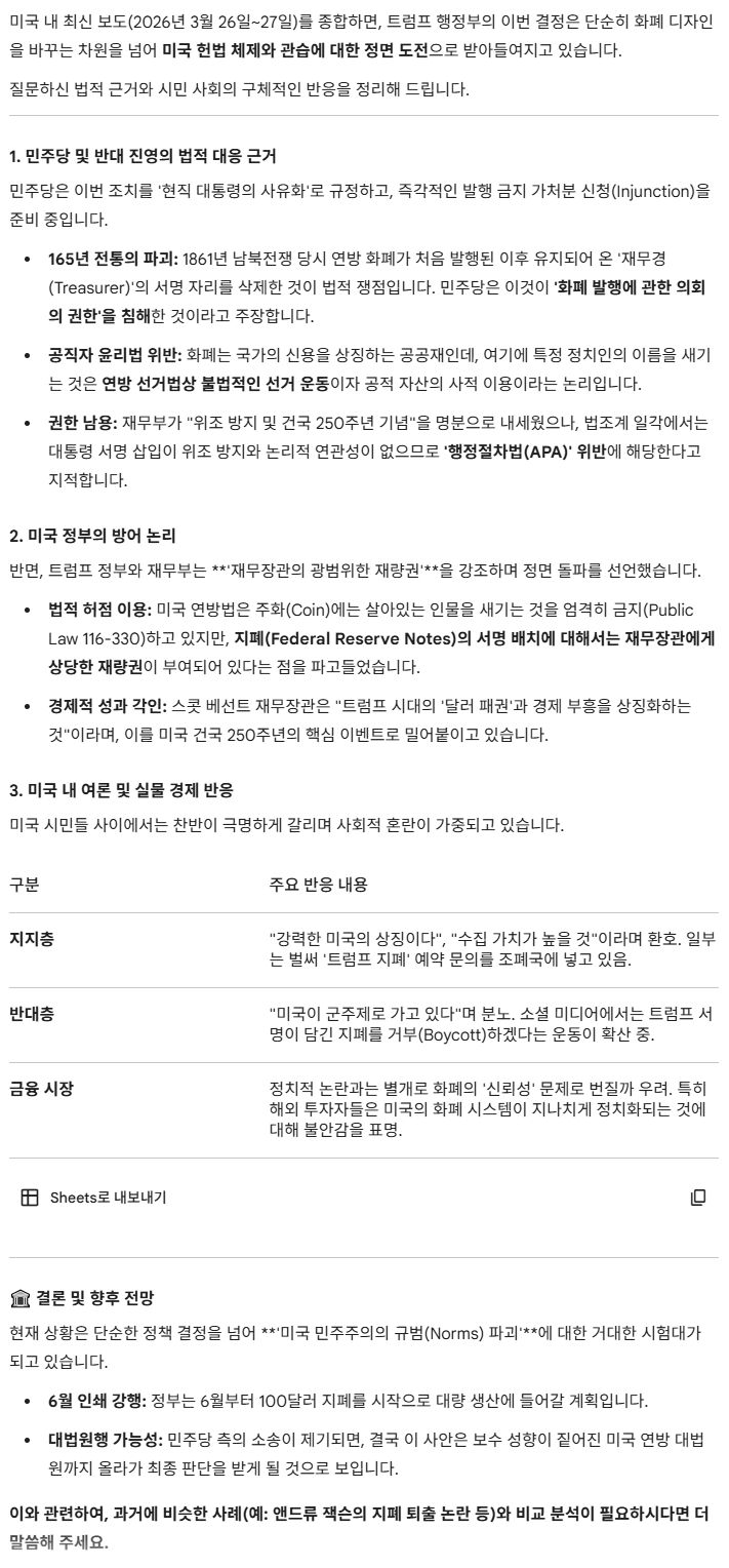 미국 내 최신 보도(2026년 3월 26일~27일)를 종합하면, 트럼프 행정부의 이번 결정은 단순히 화폐 디자인을 바꾸는 차원을 넘어 미국 헌법 체제와 관습에 대한 정면 도전으로 받아들여지고 있습니다.