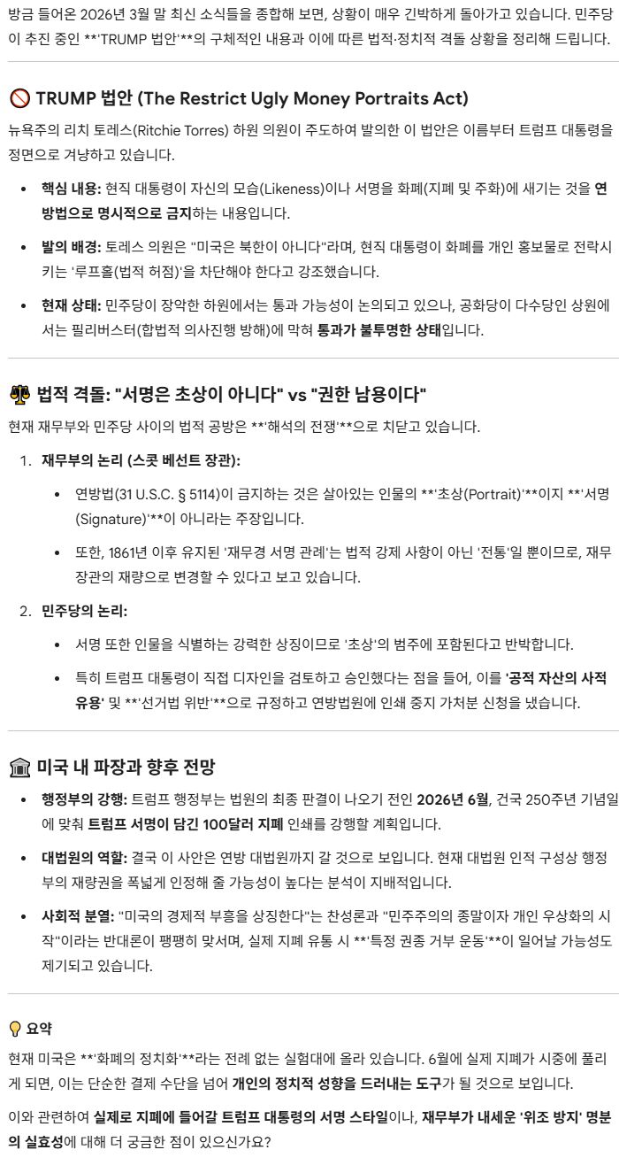 미국 민주주의의 오랜 금기였던 '살아있는 지도자의 각인'이 현실화되는 이 상황에서, **민주당이 준비 중인 'TRUMP 법안(The Restrict Ugly Money Portraits Act)'의 통과 가능성**에 대해 더 알아봐 드릴까요?