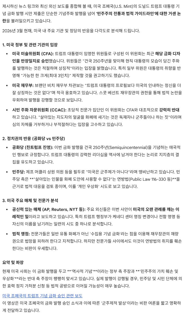 * **최신 상황 (2026년 3월 19일):** 트럼프 대통령이 직접 임명한 위원들로 구성된 **미국 미술위원회(CFA)**가 트럼프의 옆얼굴이 새겨진 **24K 기념 금화 디자인을 만장일치로 승인**했습니다.