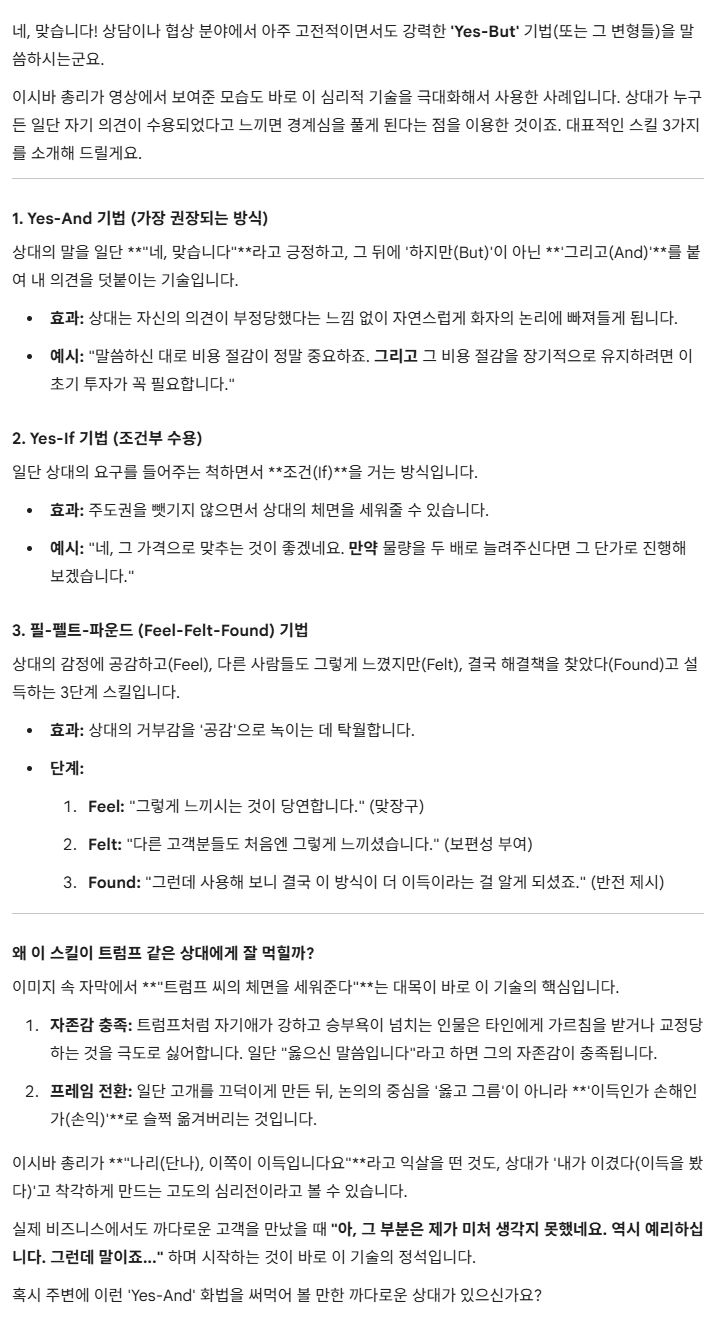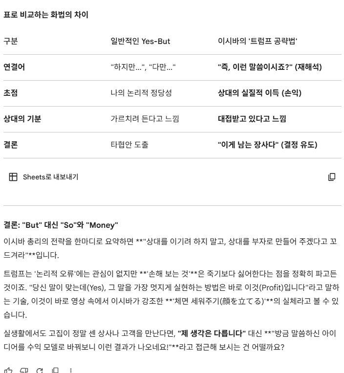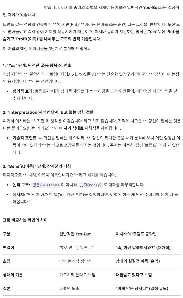 구분일반적인 Yes-But이시바의 '트럼프 공략법'연결어"하지만...", "다만...""즉, 이런 말씀이시죠?" (재해석)초점나의 논리적 정당성상대의 실질적 이득 (손익)상대의 기분가르치려 든다고 느낌대접받고 있다고 느낌결론타협안 도출"이게 남는 장사다" (결정 유도)