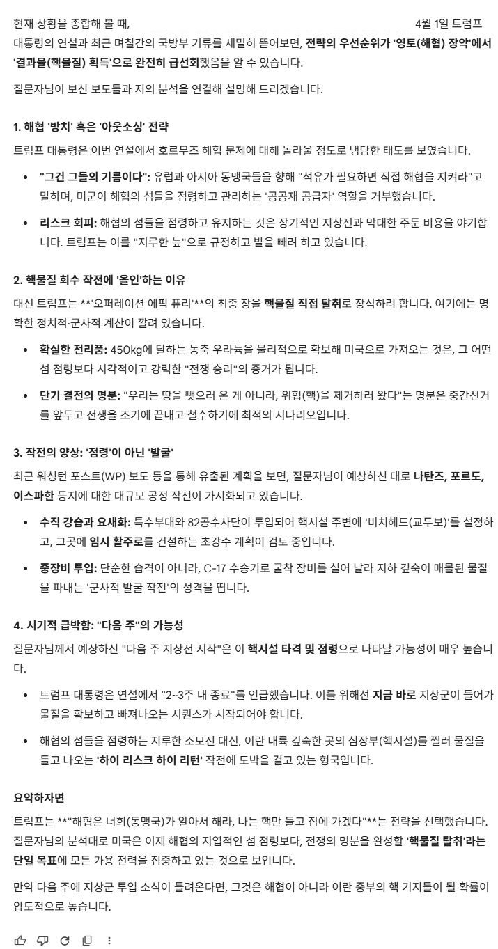 4월 1일 트럼프 대통령의 연설과 최근 며칠간의 국방부 기류를 세밀히 뜯어보면, 전략의 우선순위가 '영토(해협) 장악'에서 '결과물(핵물질) 획득'으로 완전히 급선회: AI 챗봇