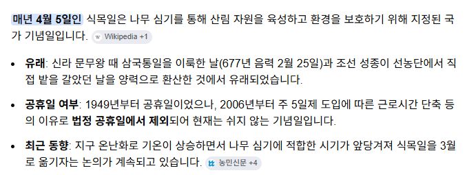 - 산불 예방 효과: 4월은 강풍과 건조한 날씨로 산불 위험이 매우 높습니다. 식목일을 3월로 앞당기면 산불이 본격화되기 전 나무를 심어 생존율을 높이고 산림 보호에 대한 경각심을 일찍 일깨우는 효과가 있습니다. [1, 2, 3, 4, 5]