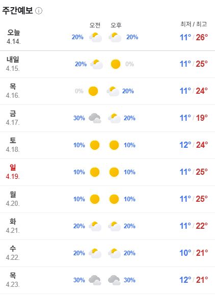 2026.4.14.화. ~4.23.목. 일평균기온 15도를 넘어가기 시작 본문