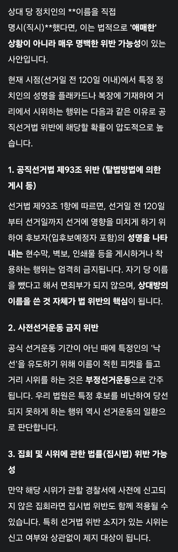 * **증거 확보:** 플래카드에 적힌 **정치인의 이름**과 **시위자들의 복장**, 그리고 **그들이 위치한 장소**가 잘 보이도록 사진이나 영상을 찍어두세요. 이것이 선관위가 현장에 출동했을 때 가장 강력한 증거가 됩니다.